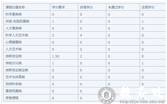 5.请学生选课前登录教务系统WEB端,在“信息查询”菜单的“成绩查询”子菜单中点击“成绩统计”选项,查看通识选修课(全校性任选课)模块学分统计情况(如图1所示),并对照本年级本专业人才培养方案确定还需修读的课程模块。张澜学院学生请按照张澜学院的相关管理办法执行。
