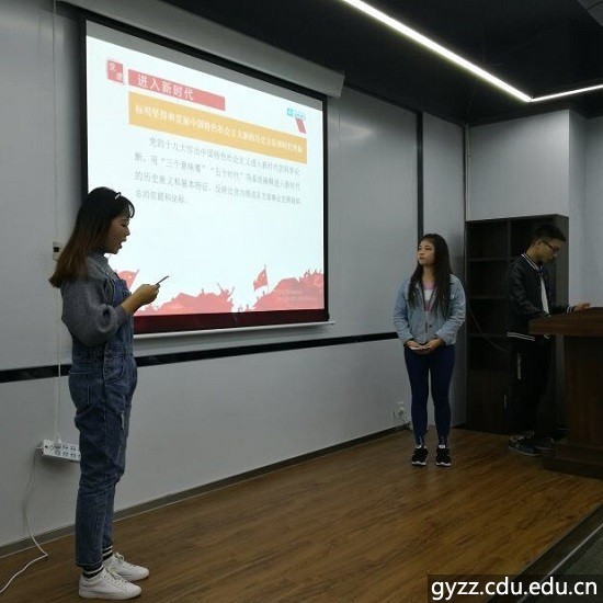 比赛过程中,各个队伍依次展现自己小组的精心准备的十九大ppt,内容丰富多彩,形式多种多样让,让底下的观众对党的十九大有了进一步的学习。有的队伍将讲解ppt与相声相互结合,在讲解内容的同时带着幽默,让台下观众耳目一新,对十九大内容的理解也更加透彻。有的队伍更是采取讲解ppt与“新闻联播”的形式展现出来,讲解十九大内容面面俱到,在其过程中还有队伍准备的采访小视频,台上的演讲者也气势磅礴,将比赛直接推向了高潮。