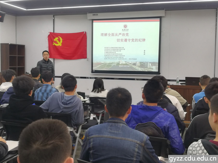 纪委办副主任(监察处副处长)黄先政老师。黄先政老师从“政治生态问题”“处于防范苏东共产党失掉执政地位”两个方面向同学们详细地讲解了为什么要全面从严治党,为什么要搞最严党纪。并且向同学们分析了若干案例,让同学们更好地掌握。随后黄老师向同学们介绍了《中国共产党廉洁自律准则》中的部分内容,希望同学们不管在生活中还是在学习中都能以一个高要求来约束自己,提升自己,争取能够早日加入党组织。最后,在同学们热烈的掌声中结束了这堂党课。