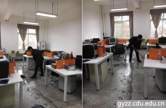 周黎明同志是该党支部的一员,他在这学期承担学院内外多个专业的多门课程教学工作。虽然暂时不能返校教学,但认真准备,积极思考,他认为,困难总是可以克服的。3月18日,为响应《成都市爱国卫生运动“卫生大扫除”工作方案》,他得知系上需要打扫卫生,积极主动承担这一任务,通过规定程序进入学校,将办公场所打扫的干干净净,赢得老师一片好评。