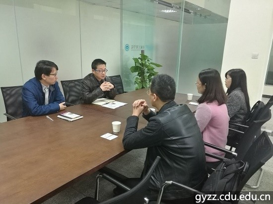 洽谈合作事宜。学院副院长唐茂和党委副书记王建武与来宾座谈。