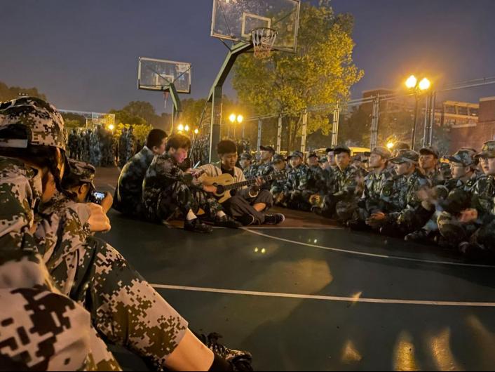 嘈杂与闷热的白日已经过去,取而代之的是静谧而凉爽的黑夜。同学们在教官的指引下,在操场上围坐成一个个圆圈。此后,多才多艺的同学上前表演节目,一展风采,获得同学们的阵阵掌声。