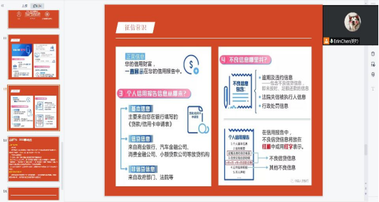 会议上,陈美玲老师首先从贷款额度、贷款期限、贷款利率、办理方式及办理时间这五部分对贷款政策进行了详细的解读,然后从诚信还款与征信常识两方面展开诚信教育。