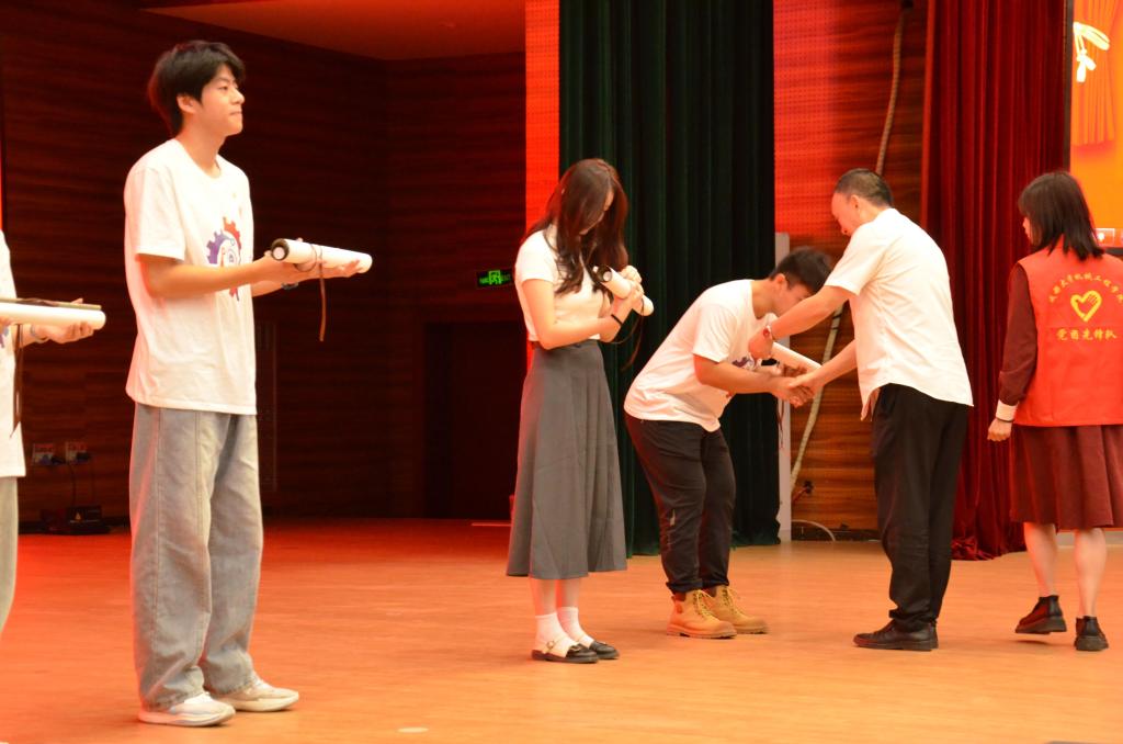 “表初心,话愿景”的活动环节将典礼推向了高潮。学院党委书记王仕平随机抽取了5位在座新生,邀请他们上台,在开学典礼之际“叩问入校之初心,描话毕业之愿景”。同学们依次表达了自己对大学生活的设定期盼,质朴而真挚的话语信心满满,道出了机械学子的心声。学院为5位同学分别送上“业精于勤”“勤学静思”“学有所成”等卷轴字画,以示勉励和鞭策。