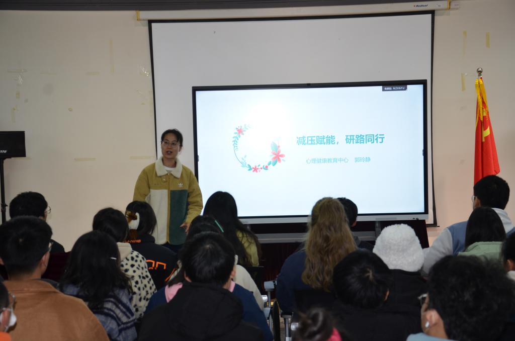 此次培训会由学工部联合科技苑党支部,邀请了学校心理健康中心的郭玲静老师为同学们做考前心里解压小讲座,同时还邀请了本院优秀的研究生同学为大家分享备战经验。