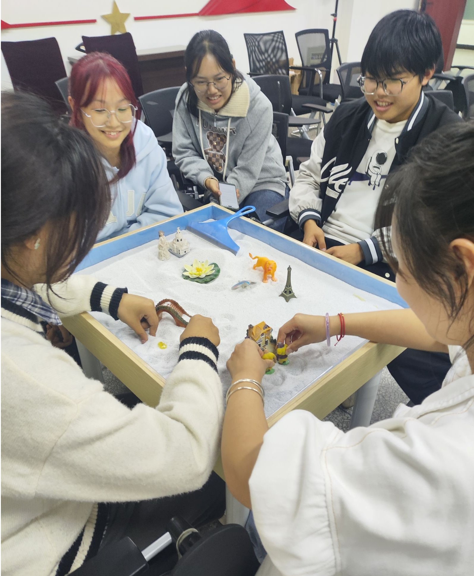 活动伊始,主持人为初次接触沙盘游戏的同学们介绍了基本的游戏规则。在轻松愉快的氛围中,同学们借助沙具和细沙构建自己的心灵世界,并向周围人分享其中的故事与感受,彼此间心灵得以交流与共鸣。沙盘游戏让同学们体验到了乐趣,也让他们深切感受到了心理沙盘在心灵治愈方面的独特魅力。这一活动不仅让大家了解了心理沙盘的作用,也有效推广了这一心理健康辅导方法。由于心理沙盘具有灵活性和非语言性,同学们能够借此表达内心情感,宣泄情绪,缓解紧张与焦虑,并在过程中获得新的自我认知和理解,从而促进心理健康成长。