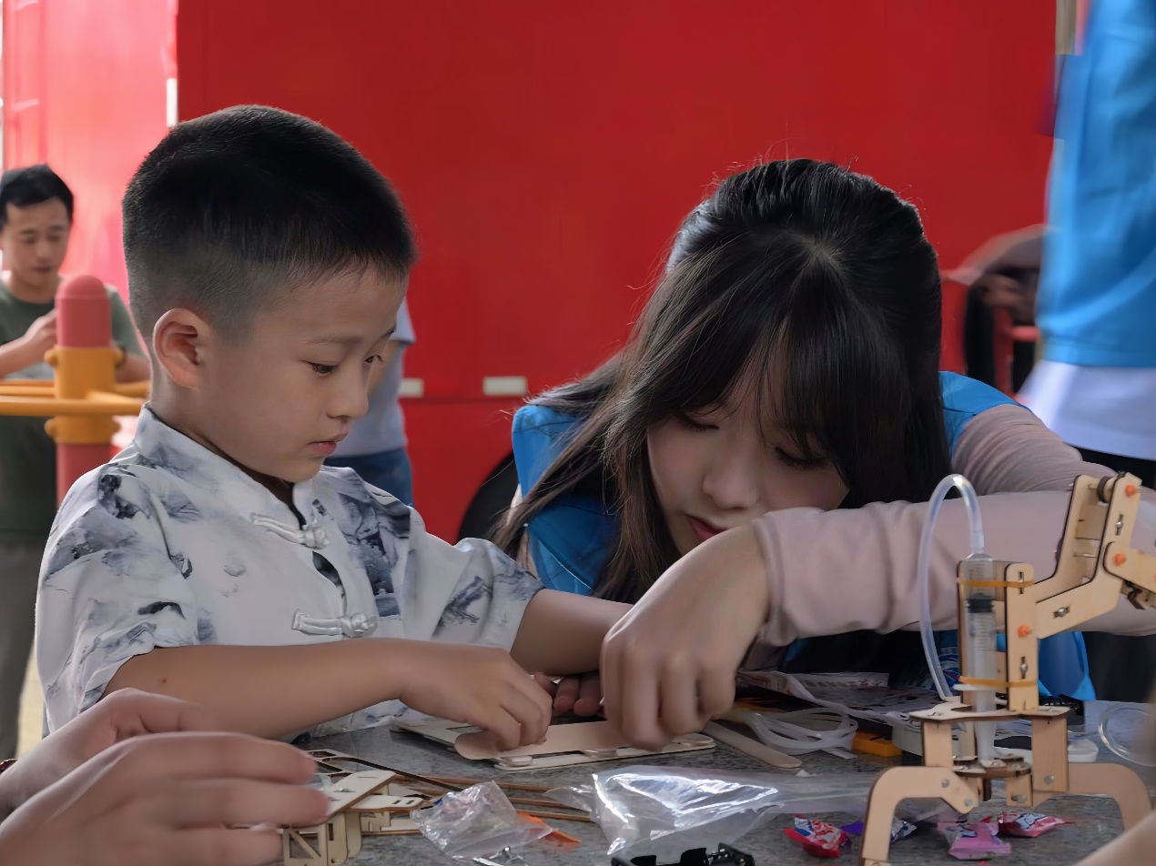 在阴平村的休闲凉亭里,一场别开生面的“乡村机械趣味课堂”悄然展开。同学们将机械原理转化为趣味实践,带领孩子们用木板拼装农机模型、用颜料为齿轮涂色,让复杂的自动化知识化作“会动的故事”。白衣服成了创意画布,沾满颜料的小手印里跃动着童真与好奇,孩子们举着拼装好的机械模型,眼中闪烁着对未来的想象。“我要发明会飞的农机,让爷爷不再弯腰!”当稚嫩的童声说出这句话时,成员们心头一颤——原来,机械科技的种子不仅要播撒在田间地头,更要深植于孩子的心田。