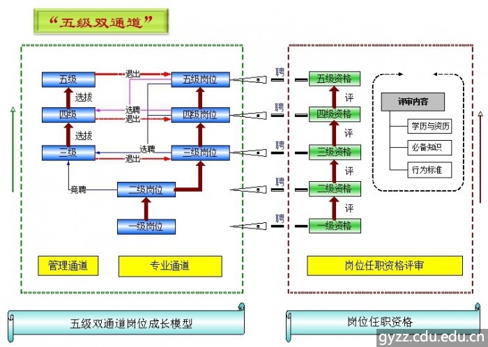 员工分为专业类、市场类、技术类、管理类,根据规范的任职体系,员工可在本类别进行成长(一级至五级),也可以通过内部招聘,合理变岗,表现优秀的可晋升为管理类干部。