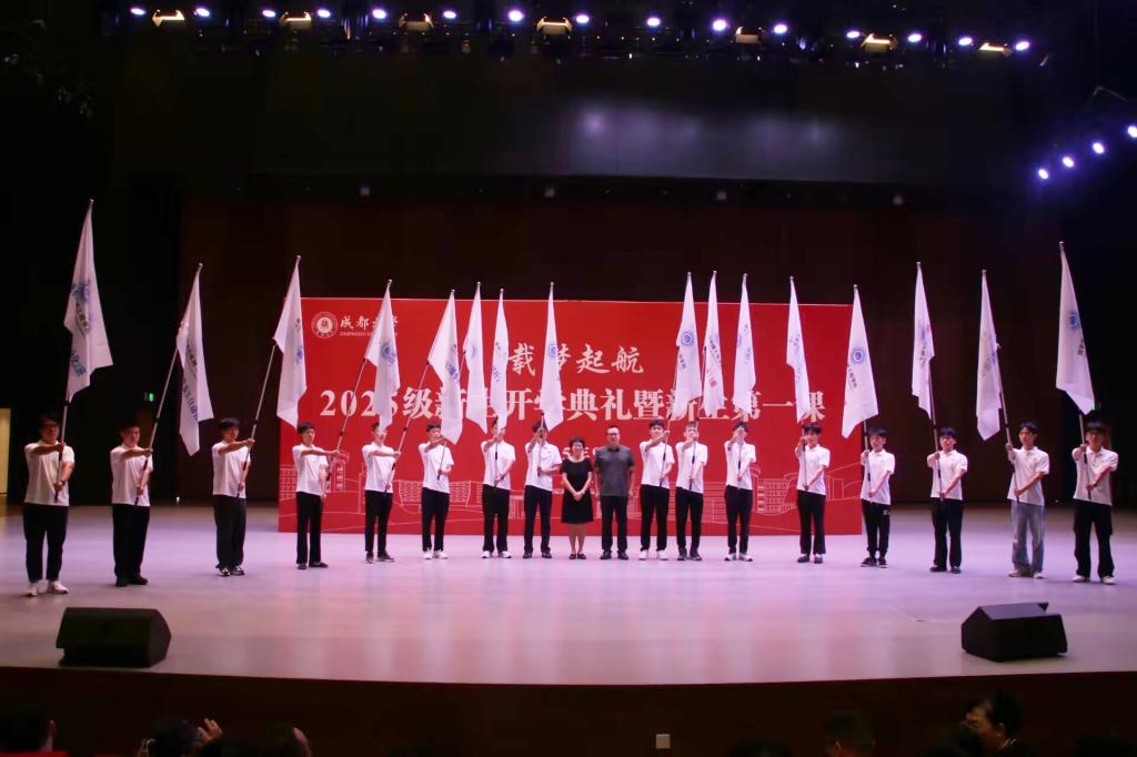 新生班级授旗仪式将典礼推向了高潮。学院党委书记涂静、院长冯威为17个新生班级授旗。希望17 个新生班级营造良好的学风、班风,涵养积极向上的班级文化。新生代表们郑重接过象征着集体、责任和荣誉的班级旗帜,齐声高呼“求真务实、奋勇拼搏”,以学院院训为大学学习生活承诺宣言。