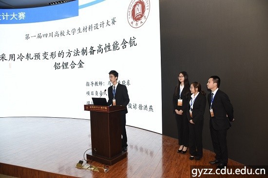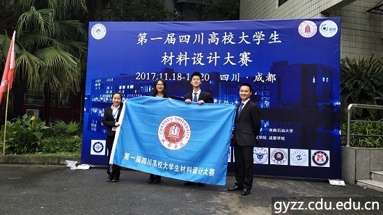 材料工程系学生雷佳浩、朱然苒、曾俊谚、徐洪燕。李文迪、雷佳浩同学分别代表团队进行了材料设计的PPT讲解与答辩,获得了专家的肯定,并听取了专家的意见,为进一步的研究工作指明了方向,两个团队均获得四川省三等奖。