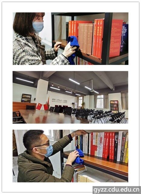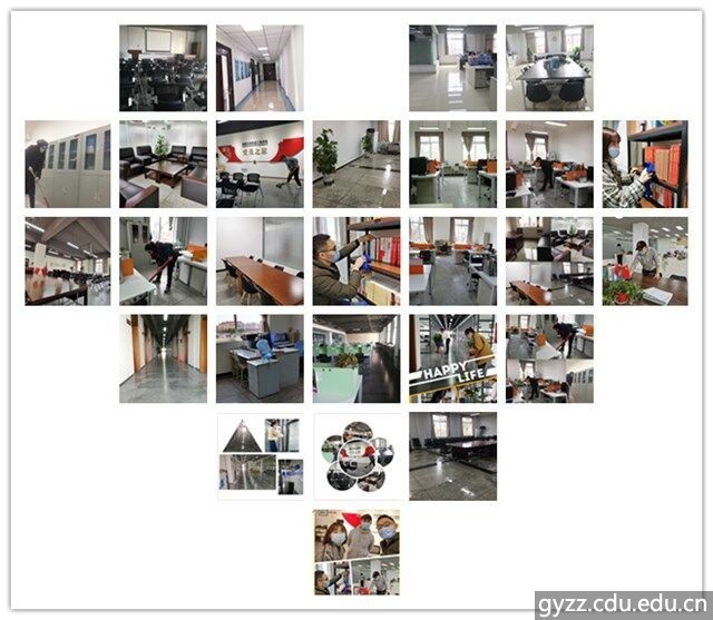 戴着口罩、手套,拿着抹布、拖把,这是今天学院清洁员的装扮。他们认真地清扫着每一个角落,学院办公区、会议室、实验室、图书馆、实训室、成龙谷C区、自习室、接待室、走廊、楼梯、厕所……万分努力,只为十分安心。