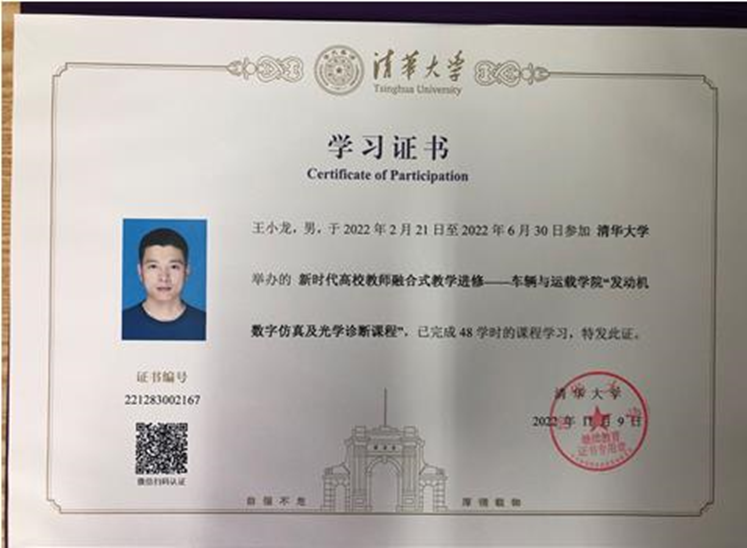 实验室安全管理水平和实验教学质量,实验技术中心教师参与了业务技能提升培训,培训人次7人。其中,实验技术中心冉龙姣、李孟华完成了数控机床操作使用培训;王小龙、陈顺洪完成了特种设备使用操作培训,包括快开门式压力容器操作和焊接操作,该培训确保了特种实验设备的安全、有序、稳定、可靠运行,保证实验教学过程的有效实施。王小龙完成了清华大学新时代高校教师融合式教学进修-车辆与运载学院“发动机数字仿真及光学诊断课程”,同时,为优化实验课程内容,王小龙还开展了虚拟仿真实验教学,该培训奠定了理论基础,切实提高了实验教师队伍的理论水平。