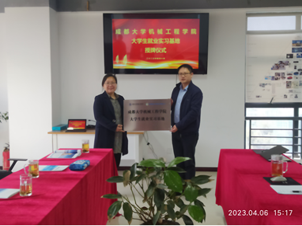 “大学生就业实习基地”授牌仪式在成都盘沣科技有限公司举行。车辆工程系系主任戢敏携副系主任陈双喜、副系主任康小鹏、教师祁传琦、王辉;成都盘沣科技有限公司董事长贺礼强携员工张国栋、袁亮、阙于梅等出席仪式。