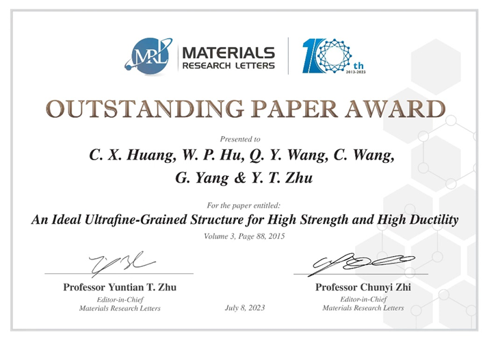 近日,《材料研究快报》(Materials Research Letters,MRL)在其创刊十周年之际进行了杰出论文奖评选。我校王清远教授所在团队关于“An Ideal Ultrafine-Grained Structure for High Strength and High Ductility”的研究荣获该期刊2013-2023年“杰出论文奖”,以表彰团队在超细晶粒金属结构材料领域所作出的研究贡献。