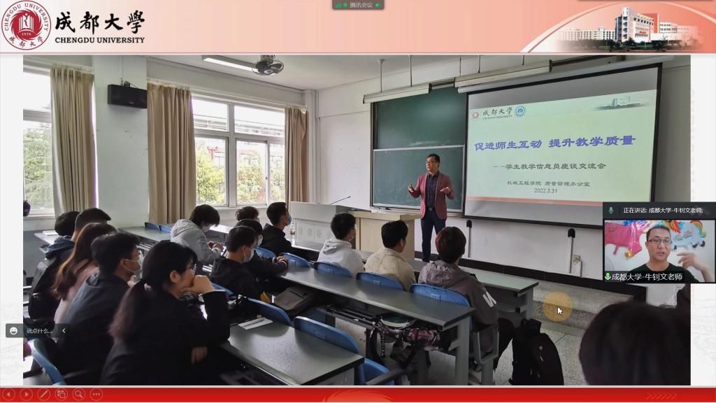 牛老师首先简要介绍了学院设立质量管理办公室的初衷及前期已开展的部分活动,表示将通过各种努力来架起师生沟通的桥梁,群策群力地共同努力来提升人才培养质量。期间,牛老师特别就即将开始的在线学习给同学们强调了一些注意事项并提供了相应的建议。