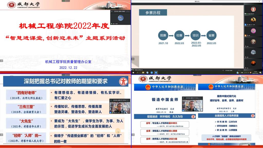 教师的教学能力与教学水平,激发广大教师更新教育理念和创新教学方法的热情,充分发挥教学比赛在推动教师队伍专业成长中的示范引领作用,学院于12月22日下午通过腾讯会议平台在线举办了以“智慧进课堂,创新迎未来”为主题的系列讲座及教师教学比赛活动。学院非常重视本次活动,面向全院教师开放。