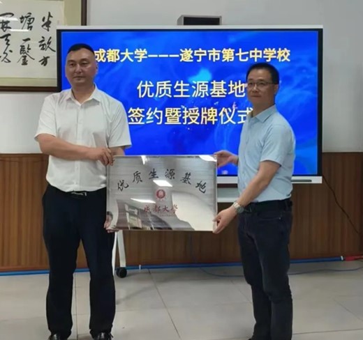 下午,一行四人来到遂宁市第七中学,其学校的党总支书记、校长袁勇,副校长唐新、曾明凤、赖文及党政办主任张明春参加了签约授牌仪式。袁勇校长介绍了遂宁市第七中学的学校概况、校园文化、生源质量、近些年取得的成绩等。袁勇校长表示将以此为契机,整合优质教学资源,深耕教学,潜心育人,为高校输送一批批思想正,成绩优,能力强的国家栋梁之才。随后,双方签署了《优质生源基地合作书》,并授牌。