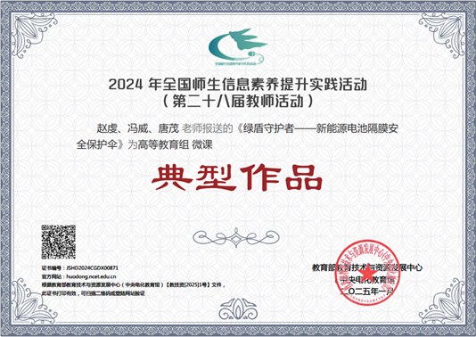 教师赵虔、冯威、唐茂团队的微课作品《绿盾守护者——新能源电池隔膜安全保护伞》在高等教育专项中脱颖而出,成功入选全国“典型作品”。