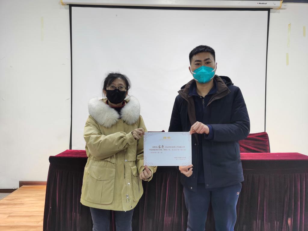 2022年创新创业导师。学工办主任陈康为三位导师颁发聘书,学工办陈璐主持会议。